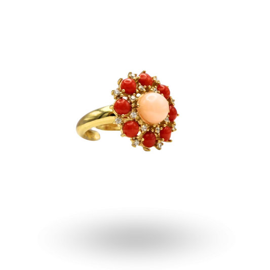 Anello in Argento 925 dorato a fiore con petali di Corallo Rosso Mediterraneo, Quarzi e centrale in Corallo Rosa