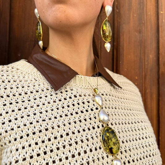 Ciondolo in Argento 925 dorato con Ambra verde e Perle