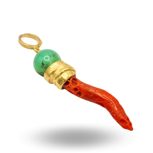 Ciondolo in Argento 925 dorato con Corno in Corallo rosso e Crisoprasio