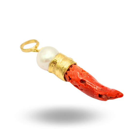 Ciondolo in Argento 925 dorato con Corno in Corallo rosso e Perla