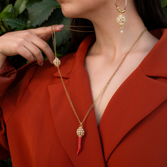 Collana in Argento 925 dorato con Corno in Corallo e mina con coroncine in Perle