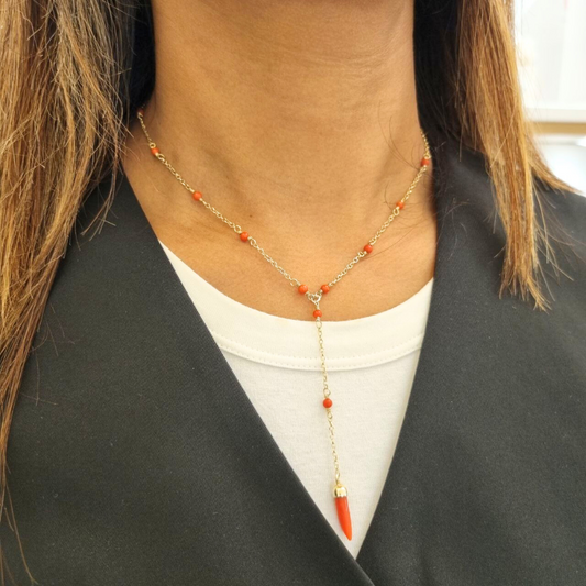 Collana a girocollo in Argento 925 dorato con pallini e cornetto finale, entrambi in Corallo rosso Mediterraneo
