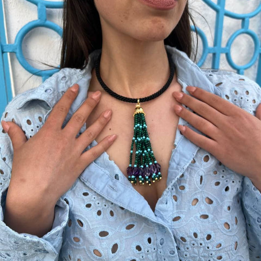 Collier girocollo con cordone rigido e ciuffo realizzati completamente a mano, con Malachite, Ametista e Pasta di Turchese. Chiusura in Argento 925 dorato