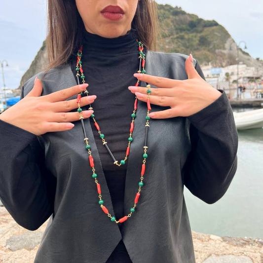 Collana in Argento 925 dorato con Corallo, Malachite e stecche di Onice