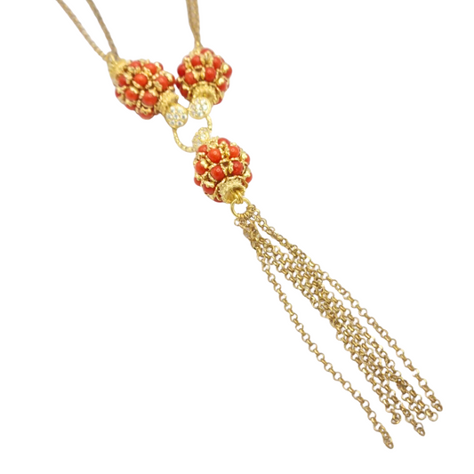 Collana in Argento 925 dorato con tre mine in Corallo rosso Mediterraneo e frange