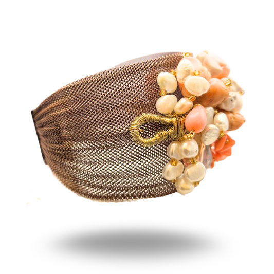 Bracciale a grappolo in Bronzo dorato con Corallo rosa e Perle. Misura grande