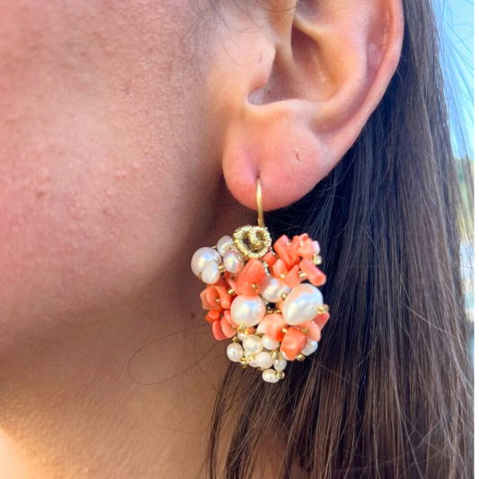 Orecchini a grappolo in Argento 925 dorato con Corallo rosa e Perle