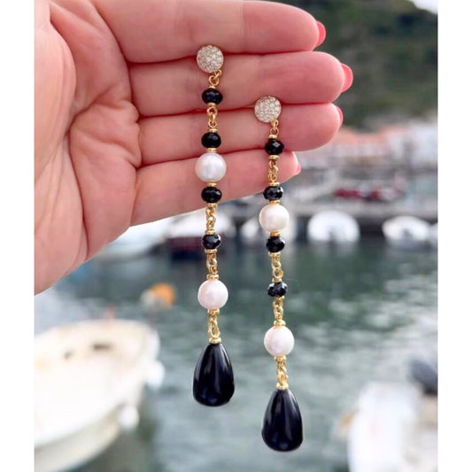 Orecchini in Argento 925 dorato pendenti con goccia in Onice, Perle e Spinelli neri