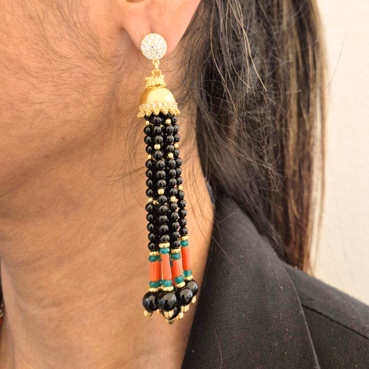 Orecchini Linea Mala in Argento 925 dorato con ciuffi in Onice, Corallo rosso e Giada