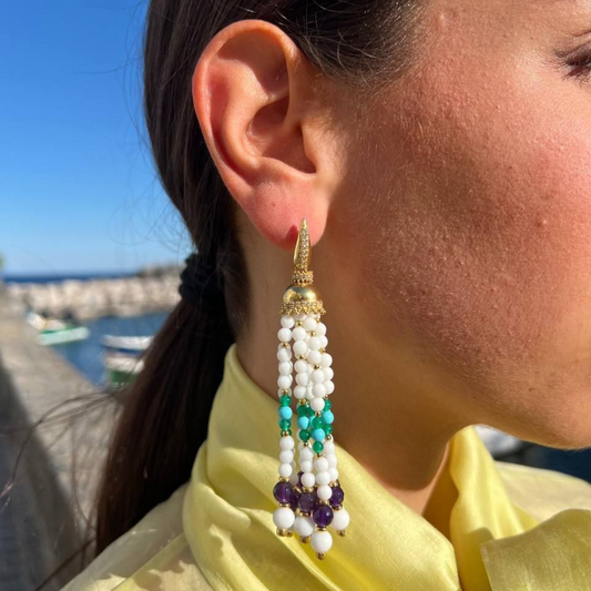 Orecchini Linea Mala in Argento 925 dorato con ciuffi in Agata bianca, Ametista, Giada e Pasta di Turchese