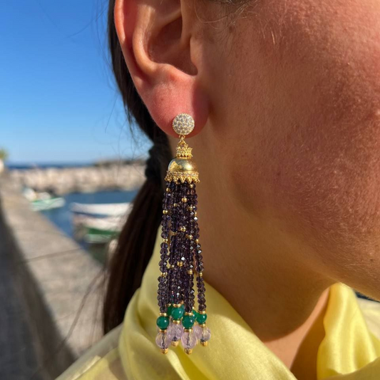 Orecchini Linea Mala in Argento 925 dorato con ciuffi in Ametista, Quarzi e Giada