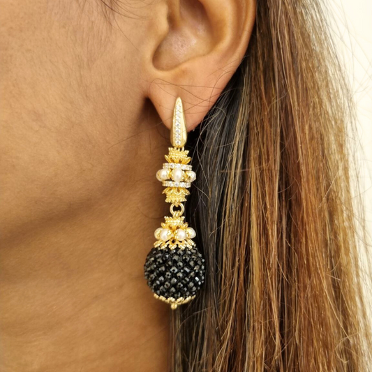 Orecchini linea Barocca in Argento 925 dorato con sfere di Spinelli neri con lavorazione Tessito compresa tra due coroncine in Spinelli neri e pallino finale pendente