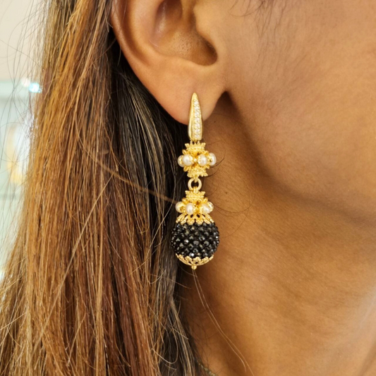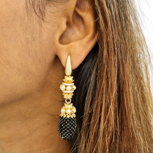 Orecchini linea Barocca in Argento dorato con mine in Perle e sfere di Spinelli neri con lavorazione Tessito Mis. grande