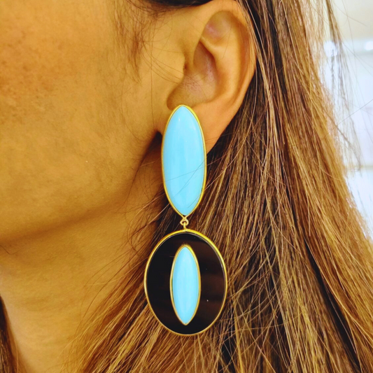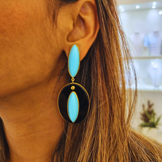 Orecchini in Argento 925 dorato con 3 piastre ovali in Onice e Pasta di Turchese