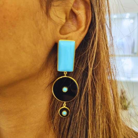 Orecchini in Argento 925 dorato asimmetrici con Piastra ovale e tonda in Onice e doppia spola in Pasta di Turchese ovale e rettangolare