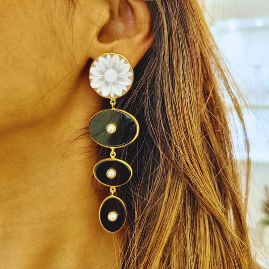 Orecchini in Argento 925 dorato asimmetrici con piastre di Onice, Perle e Cammeo tondo a fiore