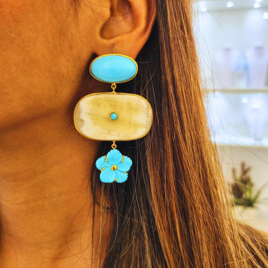 Orecchini in Argento 925 dorato asimmetrici con Piastra in Corno, spola ovale in Pasta di Turchese e terminale con spola a goccia e fiore in Pasta di Turchese
