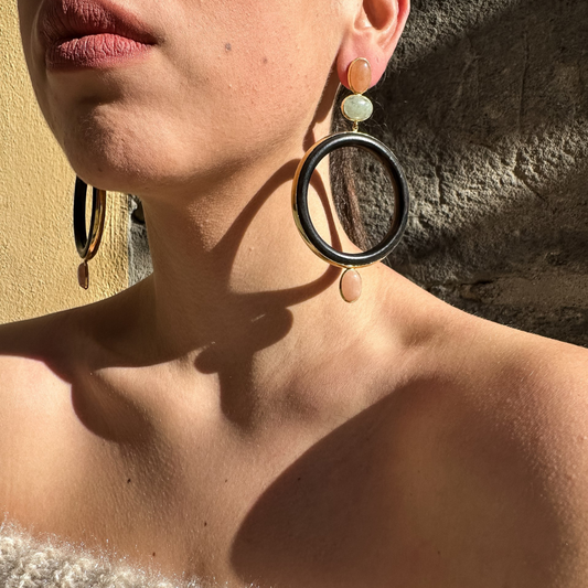 Orecchini in Argento 925 dorato con cerchi in Ebano e Berillo verde e rosa