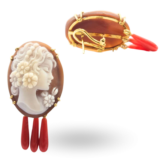 Orecchini in Argento 925 dorato con Cammei su Sardonica incisi a mano e tre gocce in Corallo rosso Mediterraneo