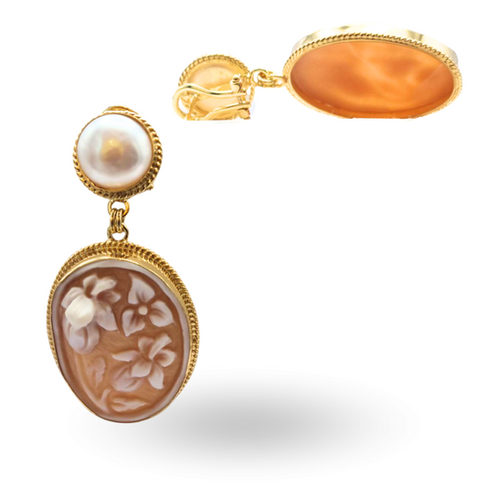 Orecchini in Argento 925 dorato con Cammeo su Sardonica inciso a mano, tema floreale, con montatura a filo lavorata a mano e Perle Scaramazze