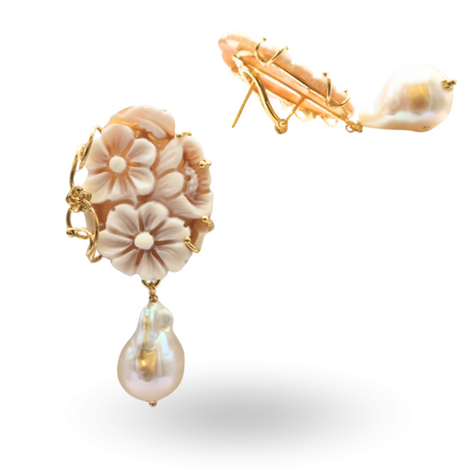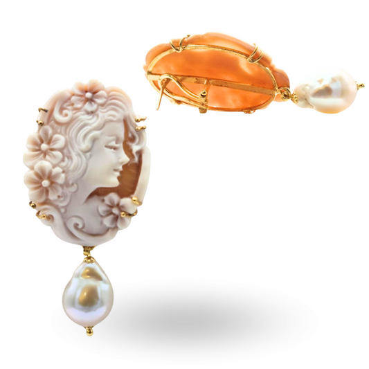 Orecchini in Argento 925 dorato con Cammeo su Sardonica inciso a mano, tema campanule, e Perle Barocche, montatura ovale vintage con trama a corda