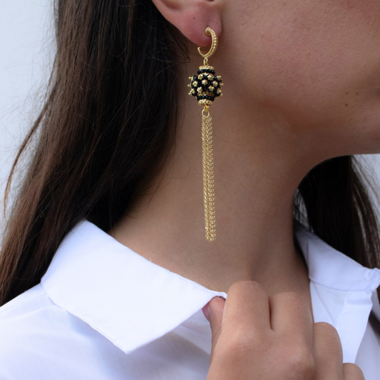 Orecchini in Argento 925 dorato con ciuffi in Spinelli neri e frange