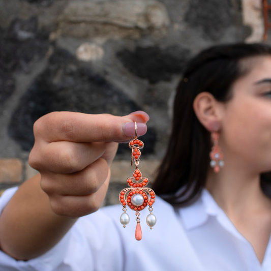 Orecchini in Argento 925 rosato con Corallo di Sciacca, Quarzo verde centrale e Perle e Cammeo pendenti