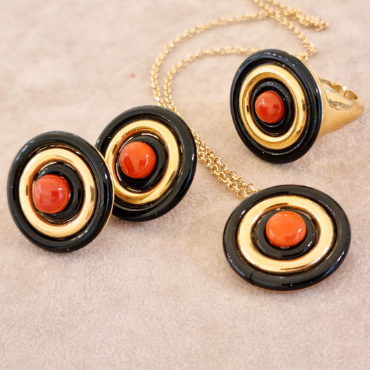 Collana in Argento 925 dorato con ciondolo con cerchi in Onice e Corallo rosso Mediterraneo