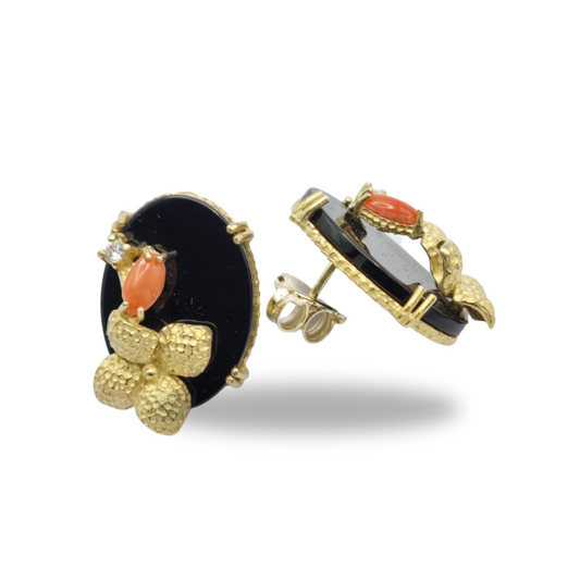 Orecchini in Argento 925 dorato con fiore su Piastra ovale in Onice e Corallo