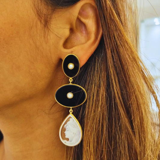 Orecchini in Argento 925 dorato asimmetrici con piastre di Onice, Perle e Cammeo a goccia con profilo
