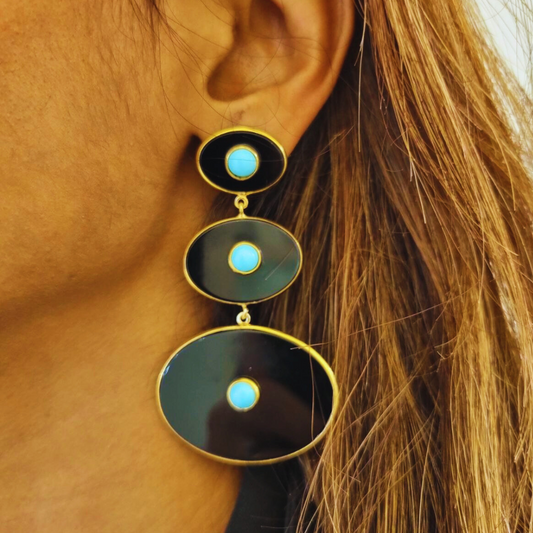 Orecchini in Argento 925 dorato con 3 piastre ovali in Onice e Pasta di Turchese