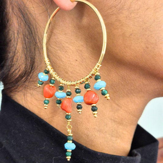 Orecchini in Argento 925 dorato a cerchio con frange ammagliate con sassi di Corallo, Pasta di Turchese e Malachite. Mis media