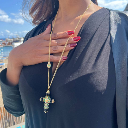 Collana in Argento 925 dorato con Croce modello More con coroncine in Giada