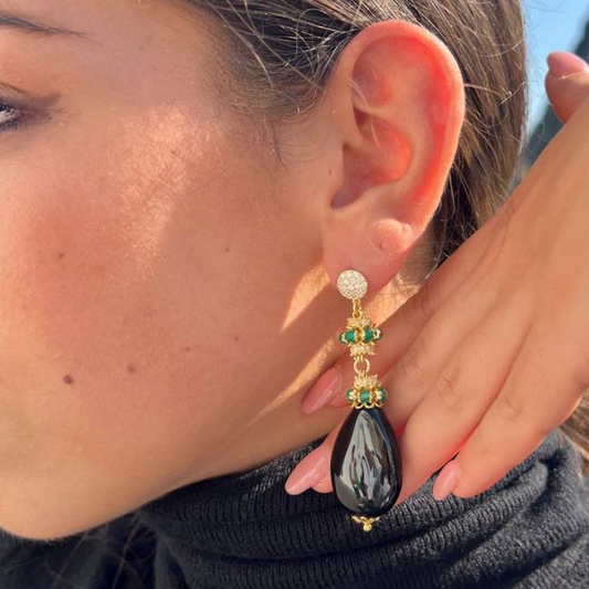 Orecchini in Argento 925 dorato con goccia in Onice, mina e mezza mina con coroncine in Corallo rosso Mediterraneo