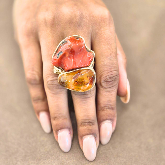 Anello in Argento 925 dorato con sasso di Corallo rosso Mediterraneo e Ambra