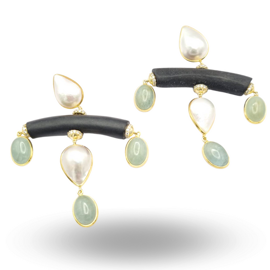 Orecchini in Argento dorato con stecca in Ebano, Perle e pendenti in Berillo verde