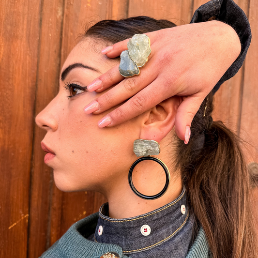 Orecchini in Argento 925 dorato con sassi di Acquamarina grezza e cerchi di Onice