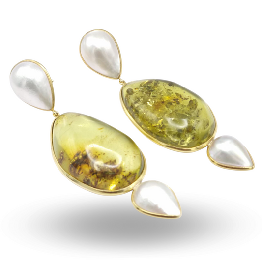 Orecchini in Argento 925 dorato con Ambra verde e Perle