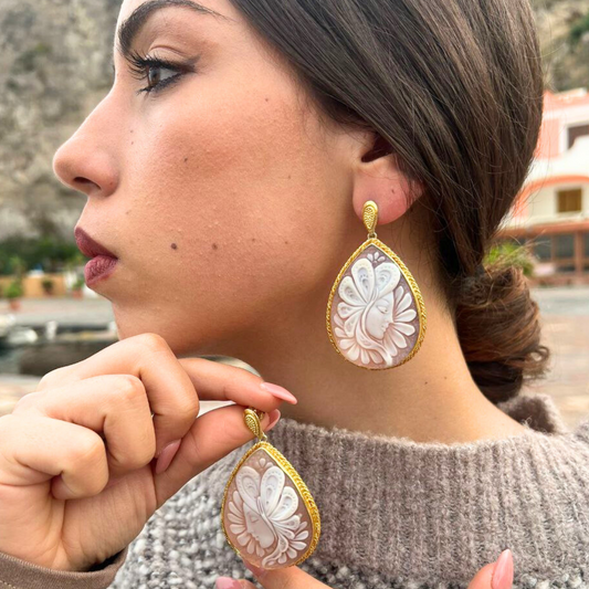 Orecchini in Argento 925 dorato con Cammeo a goccia con profilo di donna inciso a mano su Sardonica