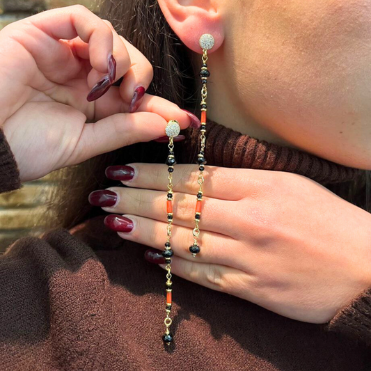 Orecchini in Argento 925 dorato pendenti ammagliati con cannettine in Corallo rosso Mediterraneo e sfere sfaccettate di Onice. Chiusura a perno