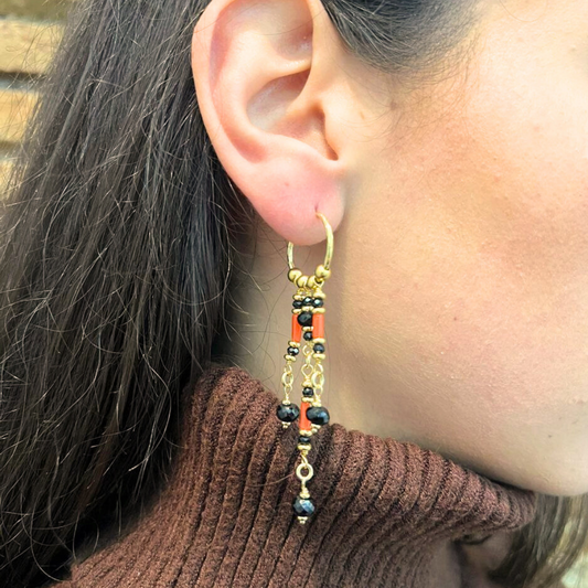 Orecchini in Argento 925 dorato a cerchio medio con tre pendenti ammagliati con cannettine in Corallo rosso Mediterraneo e sfere sfaccettate di Onice