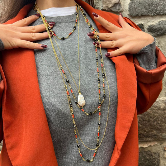Collana in Argento 925 dorato ammagliata con cannettine in Corallo rosso Mediterraneo e sfere sfaccettate di Onice. Lungh. 65cm