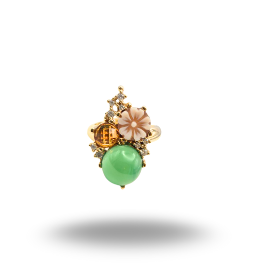 Anello in Argento 925 dorato con con Cammeo a fiore, Giada e Topazio giallo, Modello Vanity