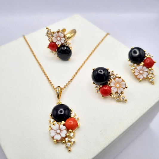 Ciondolo in Argento 925 dorato con Cammeo a fiore, Corallo, Onice e Quarzi, Modello Vanity