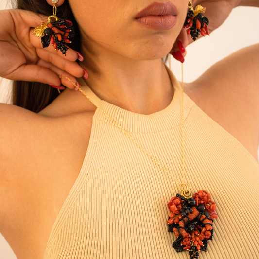 Ciondolo a grappolo con Corallo rosso Mediterraneo e Onice. Misura grande