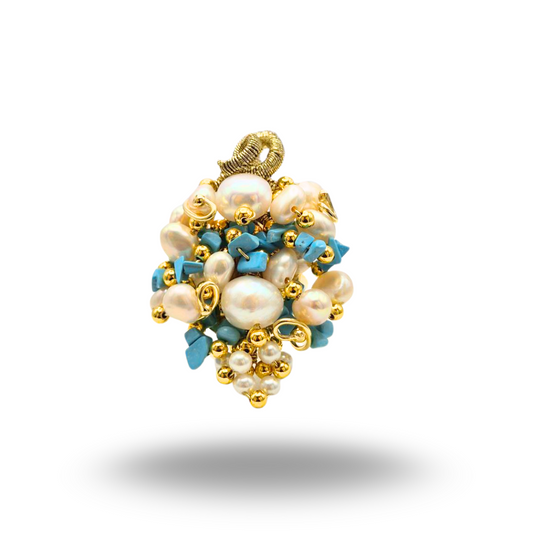 Anello a grappolo in Argento 925 dorato con con Turchese e Perle. Misura regolabile