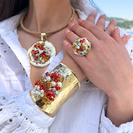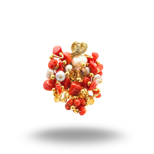 Anello a grappolo in Argento 925 dorato con con Corallo rosso, Perle e Quarzi gialli. Misura regolabile