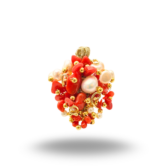 Anello a grappolo in Argento 925 dorato con con Corallo rosso e Perle. Misura regolabile