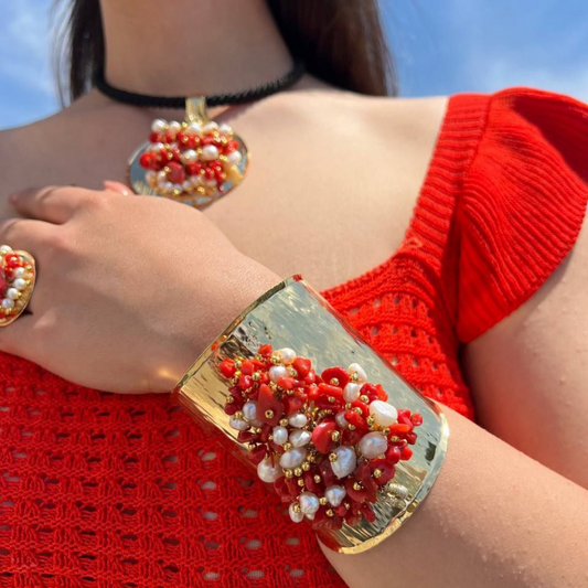 Bracciale a grappolo in Bronzo dorato con Corallo rosso e Perle. Misura grande