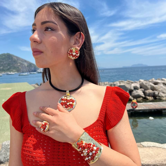 Ciondolo in Bronzo dorato con grappolo con Corallo rosso e Perle. Misura grande